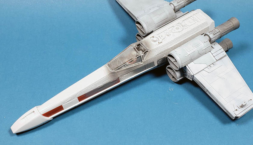 The final result thus far is the familiar shape of the classic X-Wing Fighter. I wanted to show it “pre-primer” so that it could better convey the sense of how taking a more structured approach to building goes through many stages.
