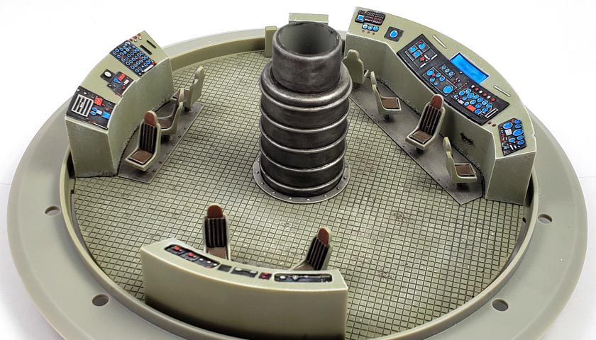 For such a large model, the interior is fairly sparse. However, it actually resembles a lot of movie flying saucer interiors from those B movies of the 50s. Lots of space, and a few large consoles with loads of dials on them. Several swivel chairs are placed in front of the consoles, all sitting on top of what almost looks like a tiled floor.